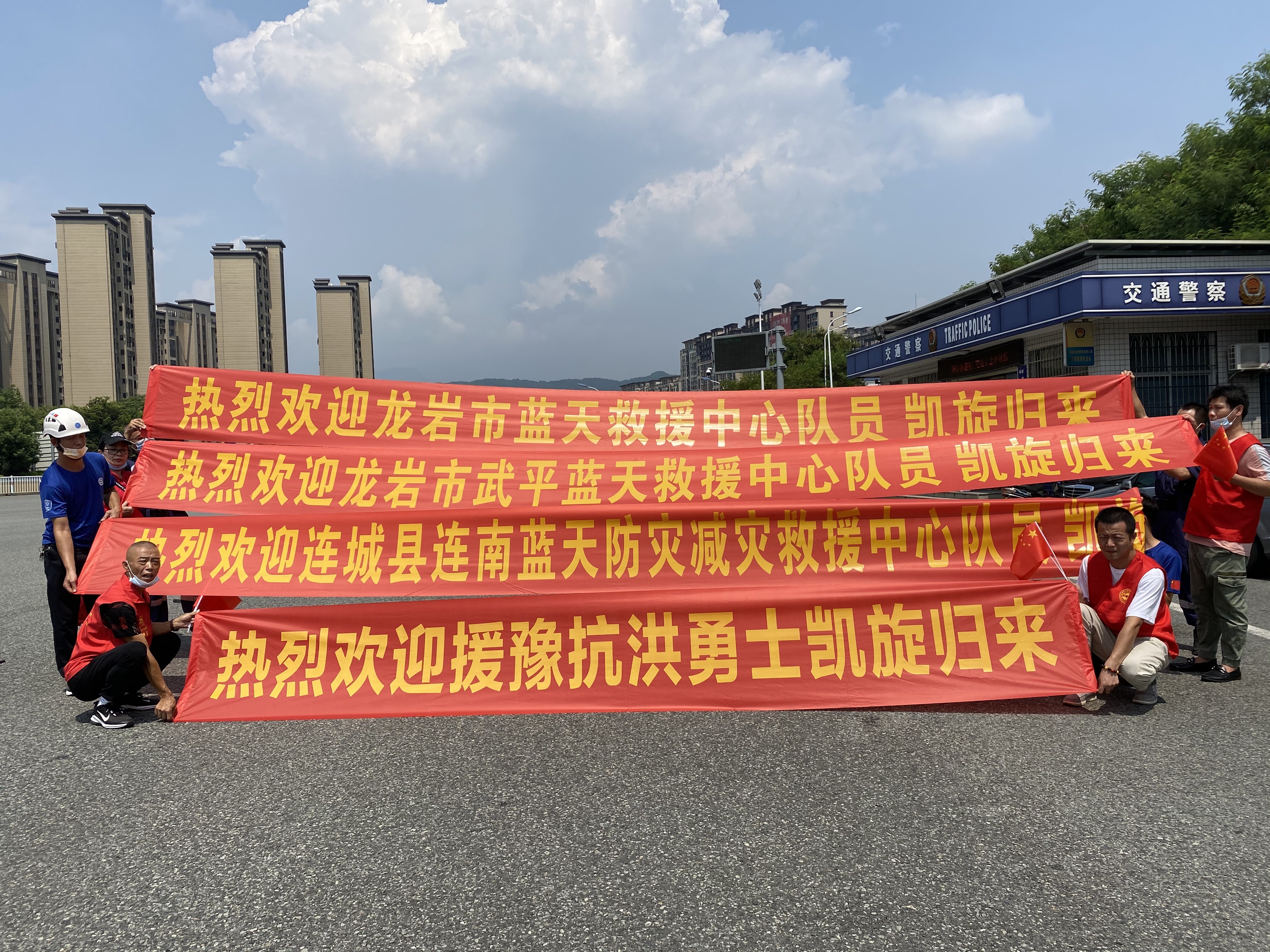 志愿者们高声欢呼,热情欢迎龙岩援豫救援队归来。