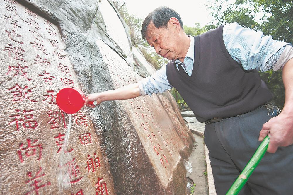 九日山过去杂草丛生、污水横流、坟墓遍地,胡家其带人上山种树、修路、修桥,迁走漫山的坟头,每天起早摸黑修葺石刻。