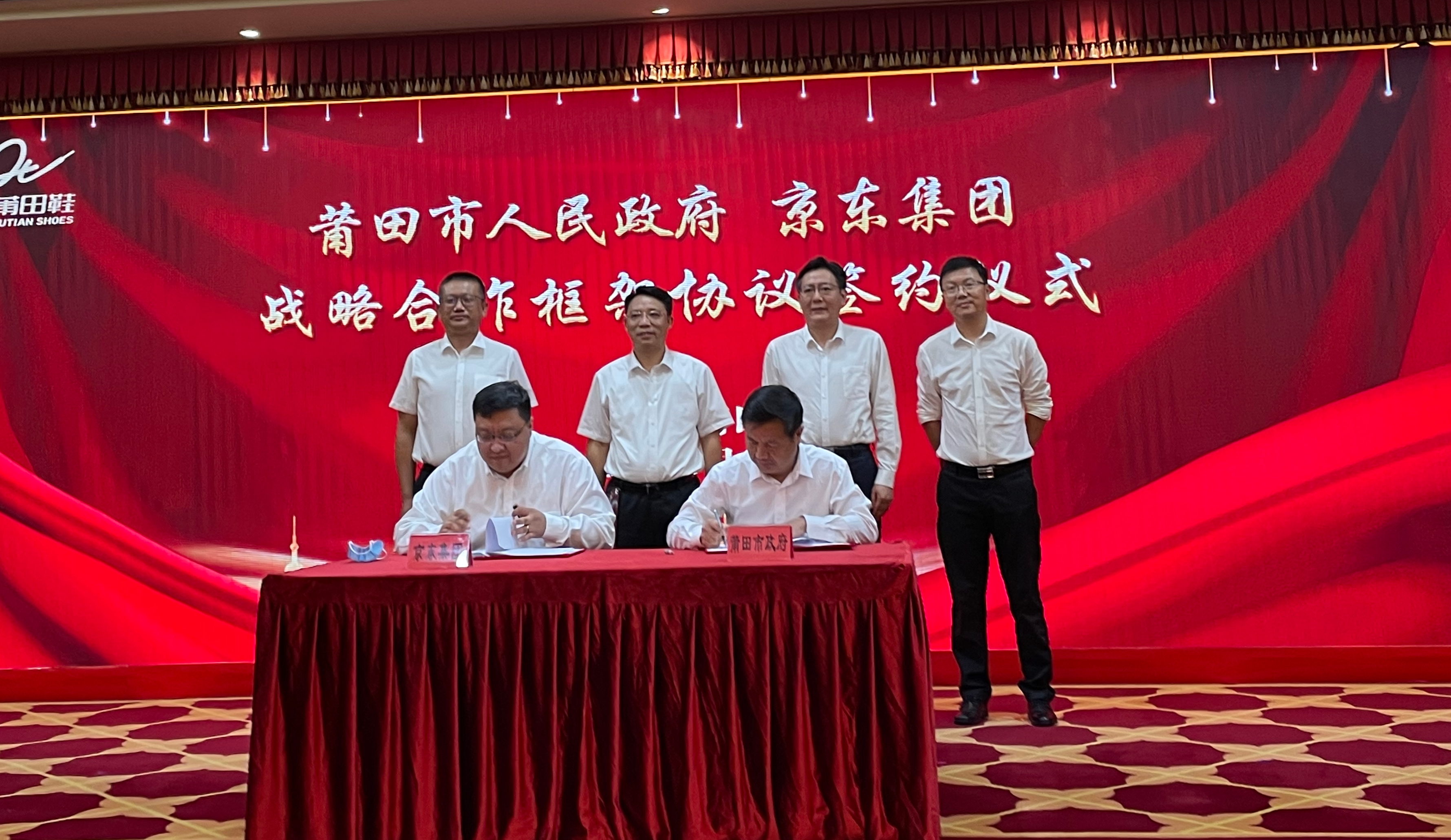 福建日报APP—新福建 8月5日讯(记者 沈琳)8月5日,莆田市人民政府与京东集团战略合作框架协议签订暨“莆田鞋”集体商标授权系列签约仪式举行。市委书记刘建洋,市委副书记、代市长林旭阳,京东集团副总裁孙志祥,市委副书记朱子君,常务副市长傅冬阳,市政府秘书长吴宗兴等出席签约仪式。