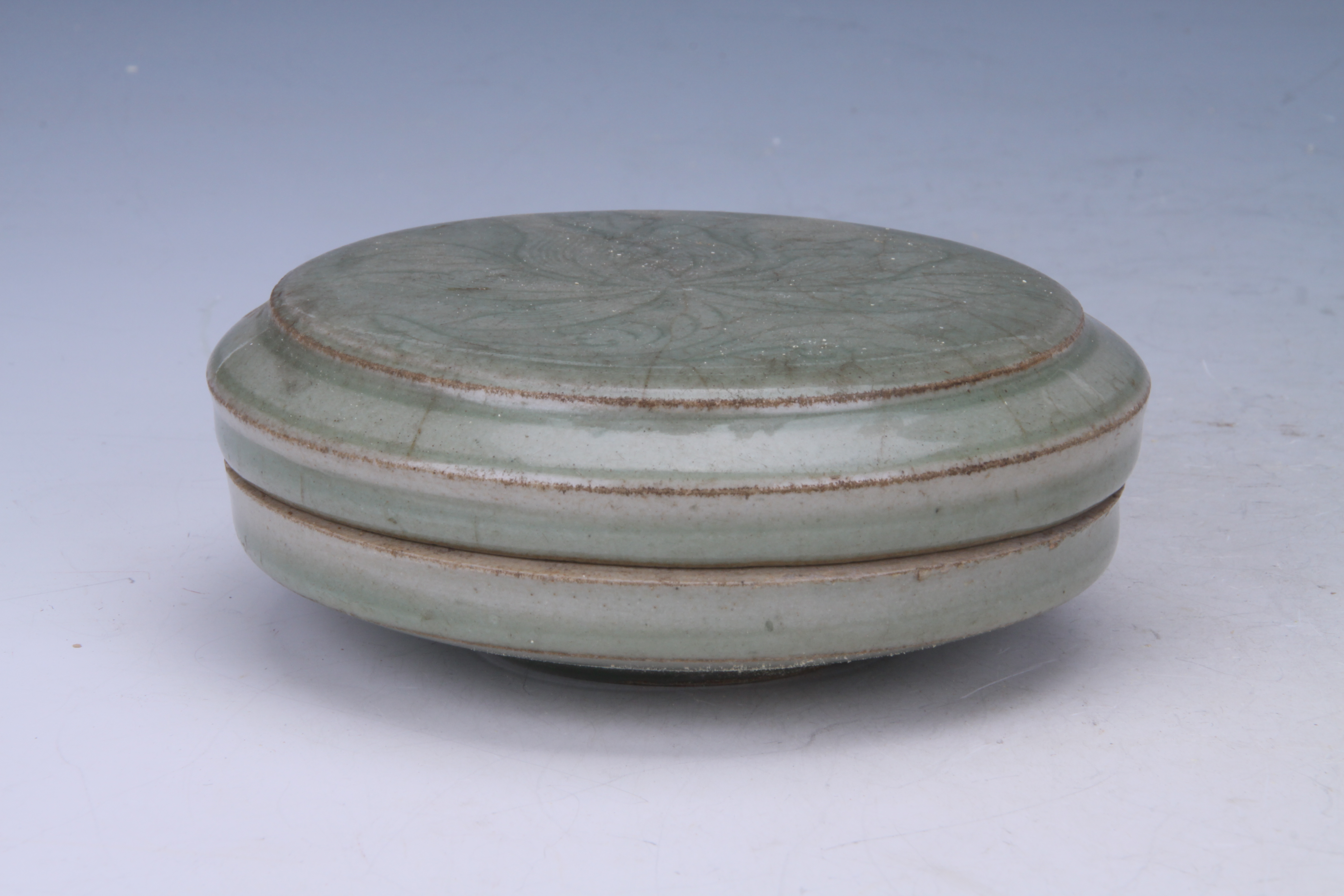 该胭脂盒产于宋代,做工细腻,胎色纯正,为子母口双层合盖,盖顶刻花为牡丹纹,纯真灵动。