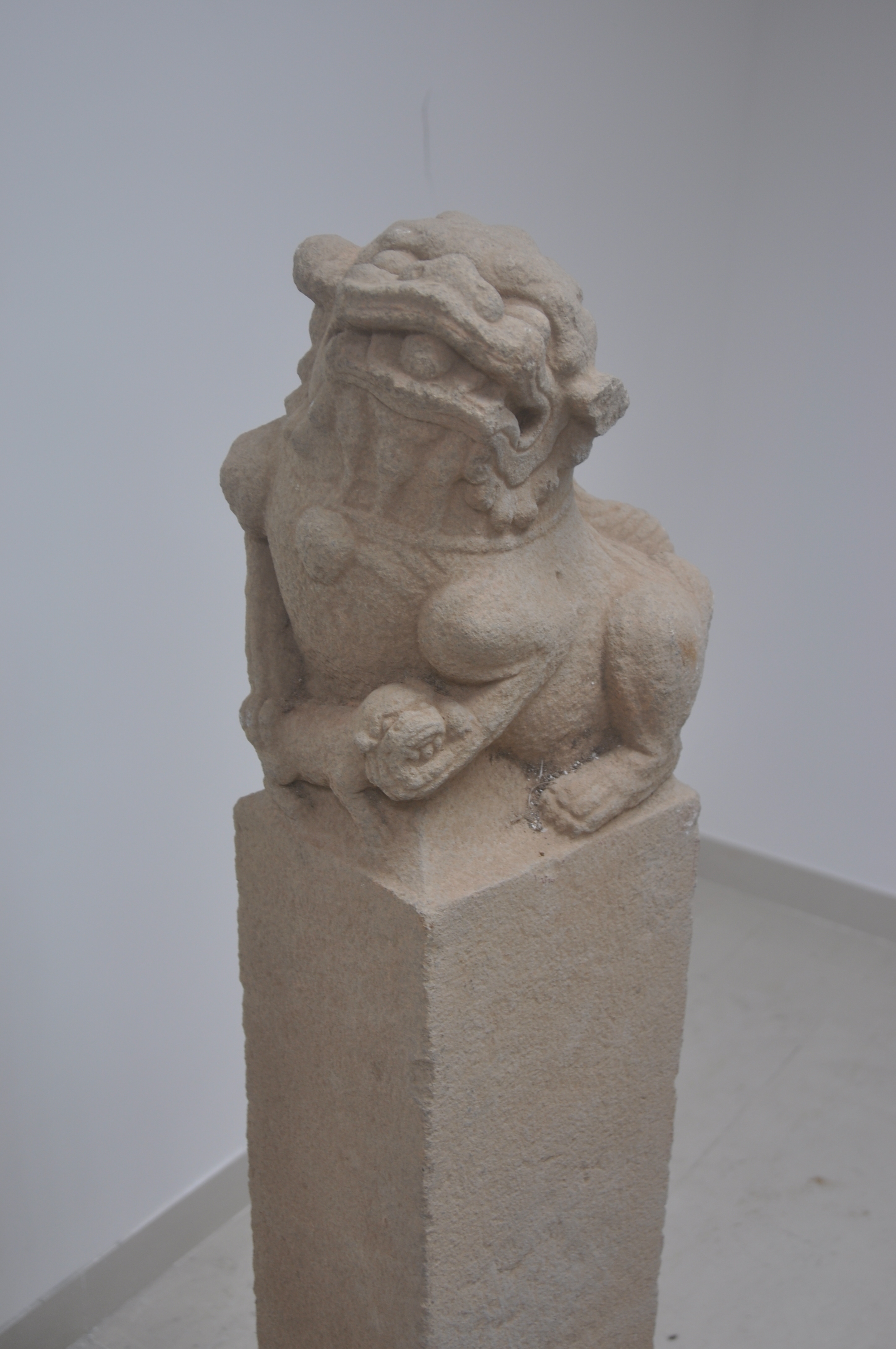 该文物为柱头装饰的石狮立柱,一般立于桥头两侧或栏板柱头,威猛不失可爱,雕琢精细,通体满工,不失为佳品。清代,征集购买,长125厘米、宽23厘米、高22厘米。