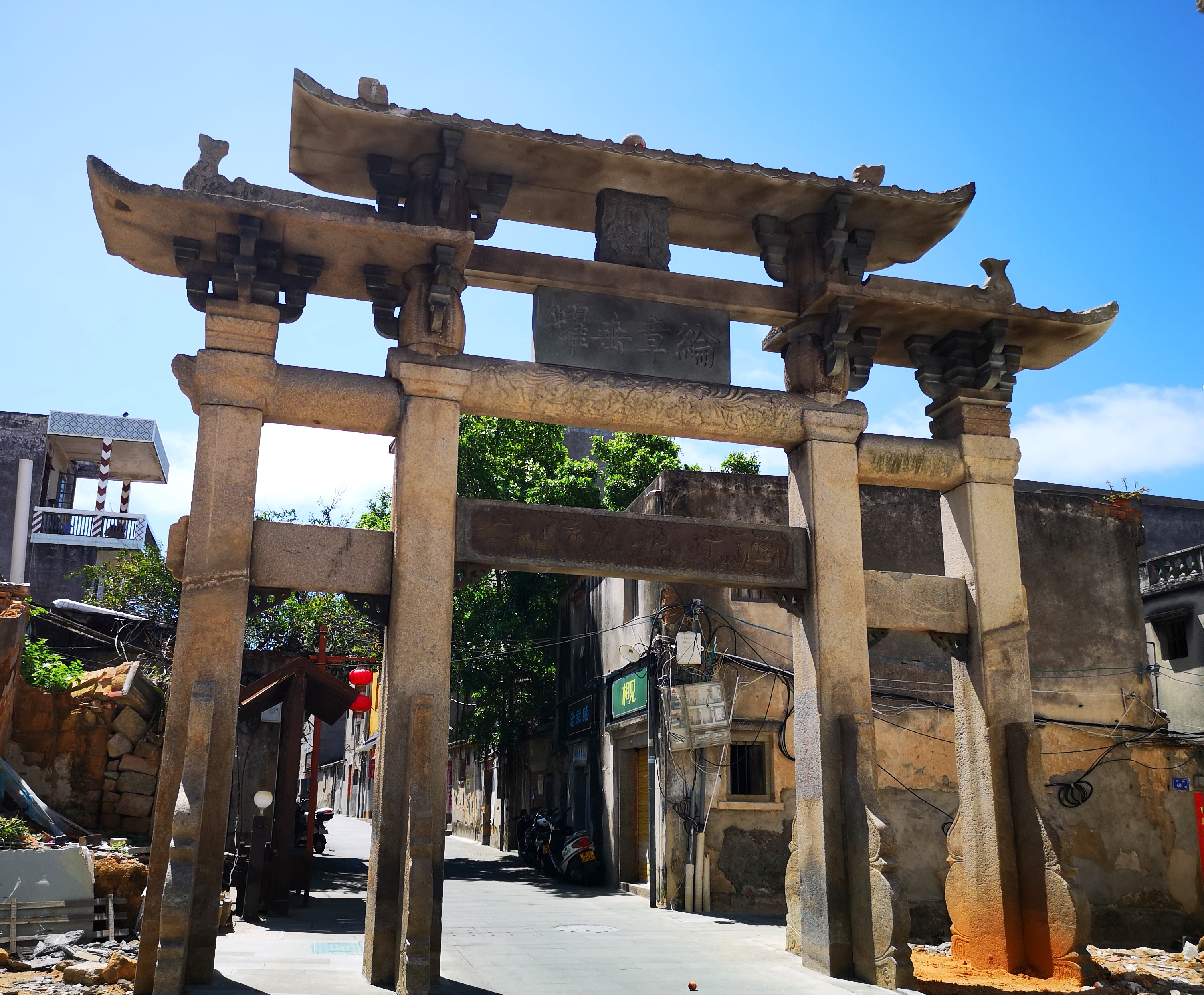 “纶章垂耀”坊(也称科弟开先坊)是一座明代石牌坊,位于东山古城内,横跨顶街老街,是为东山第一个进士唐文灿而建的,是一座“恩荣”坊,为石仿木结构,高6·7米、宽6·8米,三间四柱,已经历了几百年的历史沧桑,几度风化,牌坊构件残缺不全,横跨街区,有安全隐患。东山县于今年5月正式对这些牌坊进行修缮,拆除四周房屋,并补缺损构件,使之原真、完整地恢复牌坊原貌。