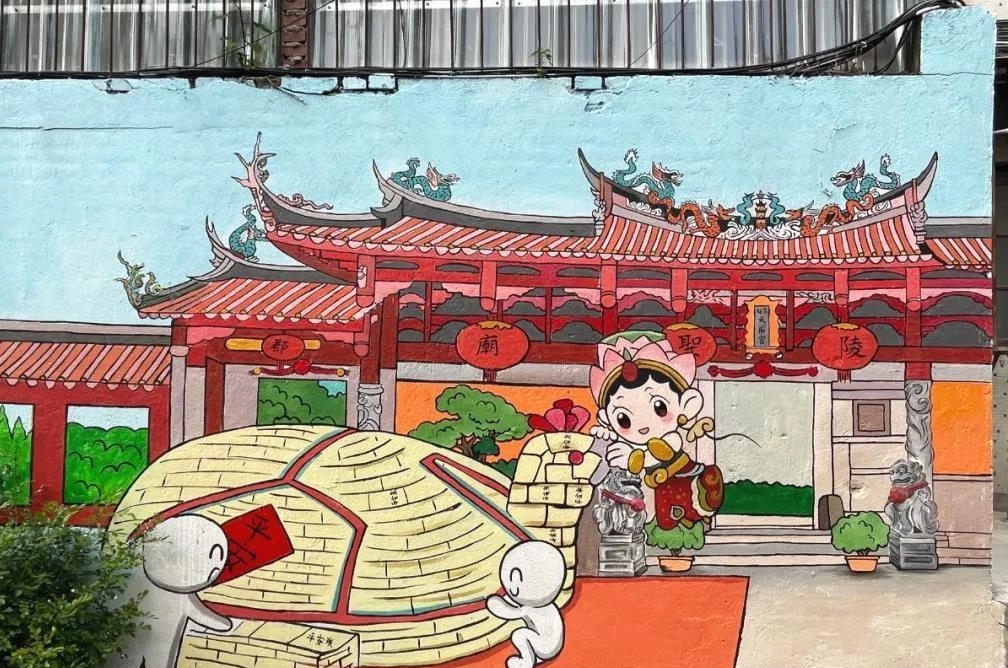 据介绍,“世界遗产”主题墙绘以鲤城辖区8个代表性遗产点为主体,融合泉州府创作的IP形象——“鲤小飞”,描绘了一幅幅生动的遗产点游览图:“鲤小飞”有时在清净寺前拍照留念,有时飞上高空俯瞰德济门遗址,有时脚踏祥云游览开元寺,有时在泉州府文庙逗鸽子,有时又在天后宫摸“米龟”……在古城墙面上,“鲤小飞”开启了一趟特殊的遗产点“打卡”之旅。