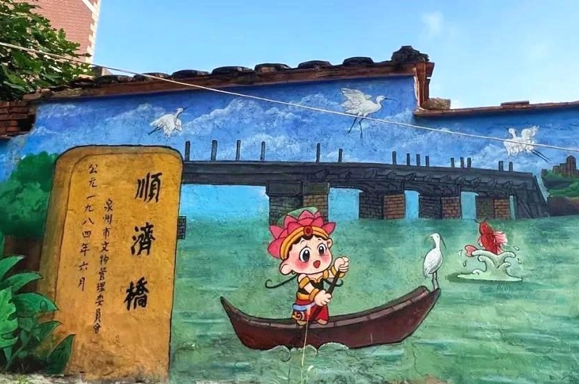 在鲤城区华新社区一面“世界遗产”主题墙绘上,只见戴着莲蓬帽、穿着闽南特色服饰的“鲤小飞”泛舟晋江,来到了鲤城南门外的顺济桥遗址,船头有白鹭悠闲停驻,不远处还有白鹭盘旋于蔚蓝空中,鲤鱼跃出水面,似在欢迎“鲤小飞”的到来。
