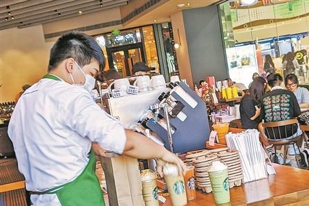 市区一家咖啡店内,工作人员正在为顾客准备咖啡。(陈晓东 摄)