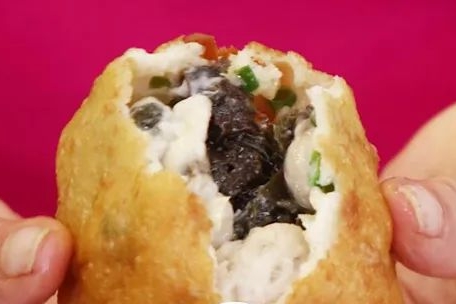 锅中倒油烧热,烧到大约60℃,先用勺子舀一小勺面糊,放上调配好的馅儿料,再加一层米糊包裹住。