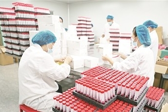 昨日,记者在博迪泰生产车间看到,繁忙的采样管生产线上,工人们戴着帽子和口罩,配液、分装、拧盖、贴签、装盒,有条不紊地忙碌着。