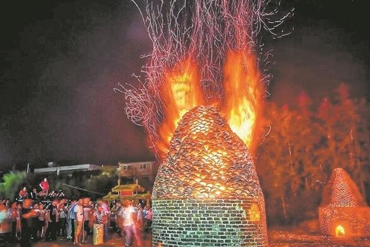此外,烧塔时,由大人牵头,带着小孩子绕着塔仔唱童谣。每人手里还拿着一包盐,绕一圈就撒一把。当盐巴碰到火,发出噼噼啪啪的响声,好像在放鞭炮。洪泓说,那三天是儿时记忆中最快乐的——熊熊火光辉映着月色,大家嘴里吃着烧塔时烤的地瓜,围观着烧塔仔的壮观场面,沉浸在一片欢乐之中。