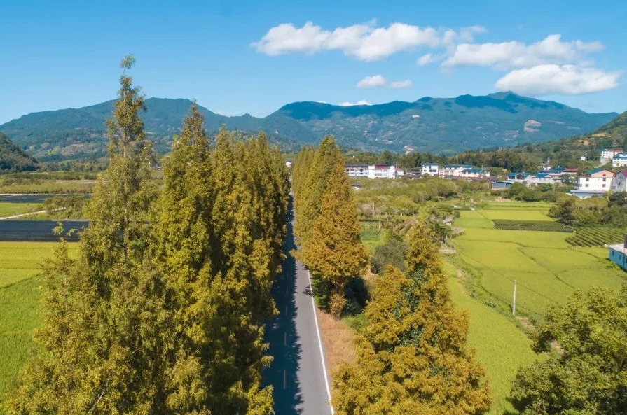 水杉染上金、稻穗弯下了腰,就像闯进宫崎骏漫画般,回到小时候,稻香在空中飘,小伙伴们在田间跑。