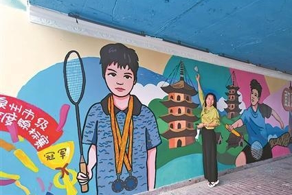 沿“奥运冠军长廊”走出几步,源昌大桥下,一幅长约28米、高2.5米,面积达70多平方米的巨幅墙绘分外夺目:墙上,黄东萍在东西塔边挑球过网,“敢想才有机会、敢拼才会赢”的冠军感言催人拼搏,击球的王懿律旁边,黄东萍、王懿律手持冠军奖牌胜利合影,“黄鸭组合”的卡通形象在一旁笑得灿烂如花。