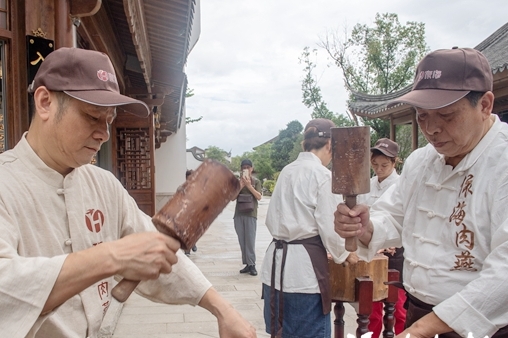 近日,福州老中青三代“打燕郎”在闽越水镇来了一次打肉燕表演。中华老字号福州依海肉燕的第四代掌门人陈彪说,邀请“封槌”的前辈出山与年轻人同台表演,是为了续写老手艺的百年辉煌。