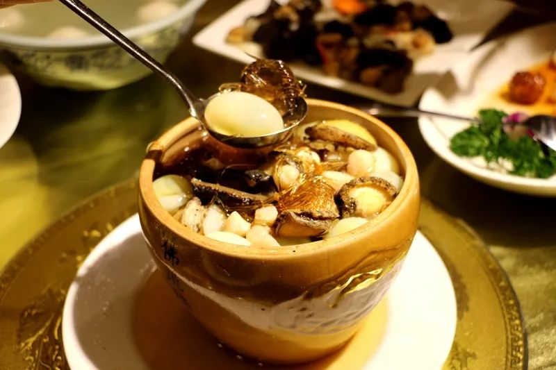“同一年三月七日《青年战士报》有一位郑木金先生写过一篇《油画家杨三郎祖传菜名闻艺坛——佛跳墙耐人寻味》,他大致说:‘庭的喜筵里也会出现此道台湾名莱,大都以芋头、鱼皮、排骨、金针菇为主要配料。其实源自福州的佛跳墙,配料极其珍贵。杨太太许玉燕花了十多天闲工夫才能做成的这道菜,有海参、猪蹄筋、红枣、鱼刺、鱼皮、栗子、香菇、蹄膀筋肉等十种昂贵的配料,先熬鸡汁,再将去肉的鸡汁和这些配料予以慢工出细活的好几遍煮法,前后计时将近两星期……己不再是原有的各种不同味道,而合为一味。香醇甘美,齿颊留香,两三天仍回味无穷。’这样说来,佛跳墙好像就是一锅煮得稀巴烂的高级大杂烩了。”——《雅舍谈吃》