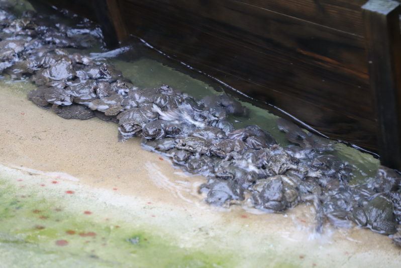 在养殖房内,可以看到,成群的蝌蚪和石鳞分布在不同的小水池内,清澈的山泉流入池子,蝌蚪们甩着尾巴在石头缝里游进游出,种蛙蹲坐在墙角边,不时还能听到几声蛙叫。目前基地里已经养了1000多对种蛙,明年将会增加到5000对。