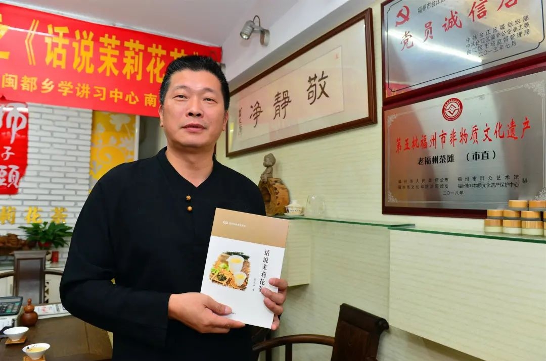 翁文峰在老福州茶摊展示科普读物《话说茉莉花茶》。(叶诚 摄)