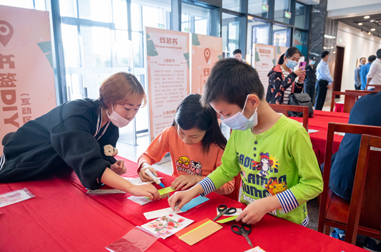 值得一提的是“爱廉说”廉政主题展览,这是一处以廉政文化书籍堆头与标语制作的美陈造型,它以活泼明朗的视觉效果,吸引了诸多现场读者的打卡拍照。而更具创意的是,它从平面展览结合非遗工艺,为读者提供“古代廉政知识”相关内容的线装书装帧体验,拉近与读者的距离,让每位到场读者都有机会与之产生更为亲切的互动,既能近距离感受中华传统文化,又可强化廉政思想教育。
