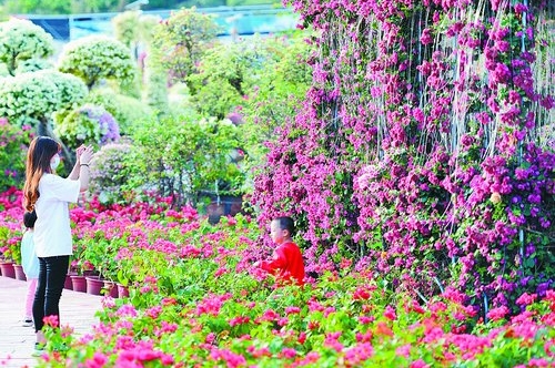 同安区古坑村千日红三角梅园内,三角梅盛开,游人争相打卡。