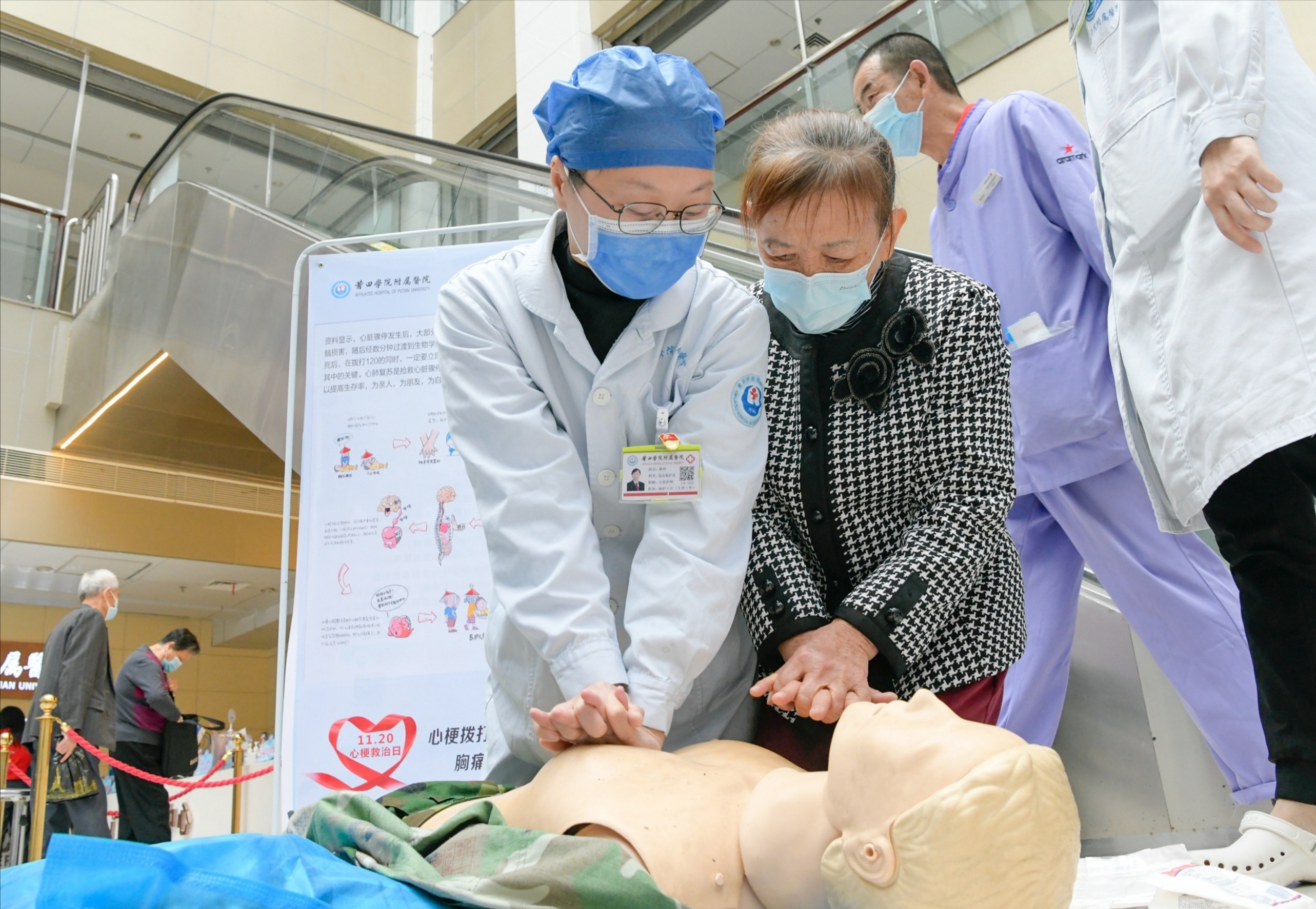 活动现场,心梗风险筛查、血压血糖测量处一字排开,医务人员一边引导就诊群众按照防疫要求有序排队,一边为大家测量体重、血压,从既往病史到日常用药、饮食,医生们耐心询问,细致地进行指导和诊疗服务。同时,医务人员还手把手指导现场群众如何进行规范的心肺复苏流程,进一步向群众普及常见的急救知识。