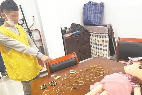 “调取监控后看到,一名头上戴着戳孔塑料袋,双手双脚也套着塑料袋的人在店里翻找,找到柜台钥匙后,他逐一打开柜台,有选择性地挑选了一些黄金首饰和玉器,未被盗走的货品价值百万元。”翁先生告诉记者,盗贼并未将所有货品盗走,而是有选择性地盗走了一个玉手镯、一套黄金项链、两串黄金貔貅项链、三十几个女式黄金手镯、一个男式黄金戒指。
