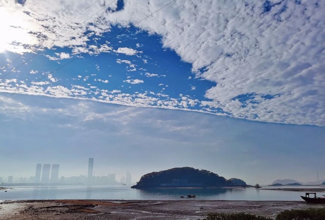 气象专家张伟解释,这种天气现象比较少见但并不“诡异”。晴空部分是絮状高积云,云层部分是蔽光性的高积云,两种不同性质的云团在冷暖气团的挤压下,云边界被“切”得十分整齐,就像天被分割成两半,有人称之为“阴阳天”。