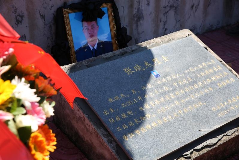 青山为之哭泣,故土为之悲恸。诏安县红星梅园奠堂正上方悬挂着黑底白字的横幅“沉重哀悼张晓杰烈士”,横幅下方张晓杰烈士遗像两边“赴汤蹈火烈士丹心昭日月,献身使命英雄肝胆映山河”的挽联格外醒目。洁白的花圈、满眼的热泪,寄托着亲人、战友、群众对张晓杰烈士的无限哀思,追忆着张晓杰光荣的一生。