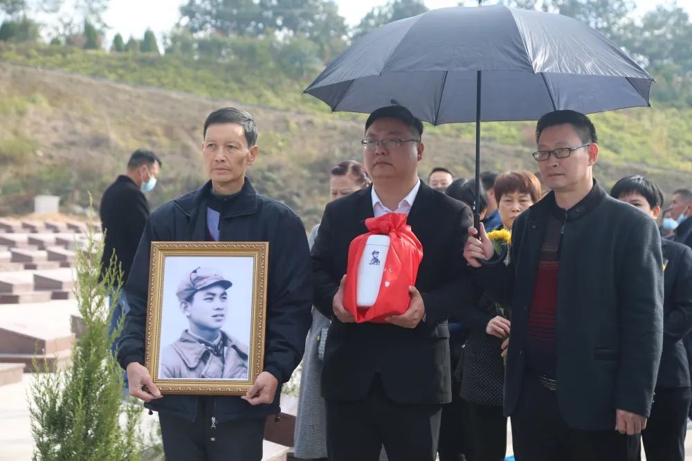 烈士的亲属手捧遗像和骨灰坛,