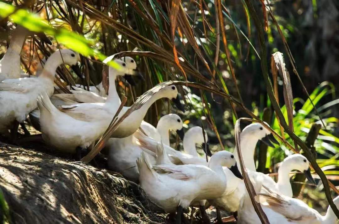在文亨镇亨明村的白鸭养殖基地,稻田和鱼塘里处处可见成群白鸭活跃的身影。明源养殖专业合作社理事长罗炳江告诉我们,白鸭可以吃田里的浮萍和微生物,鸭粪能给稻田加肥,这样,鸭肉和稻谷的品质都提升了。如今,合作社名下已有养殖基地500余亩,去年出栏白鸭22万羽,存栏10万羽,年营业额350多万元,带动了106名社员致富。