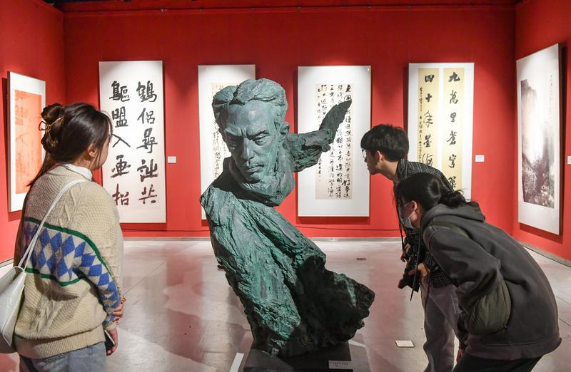 观众近距离观看第八届福建艺术节美术书法优秀作品展雕塑作品。