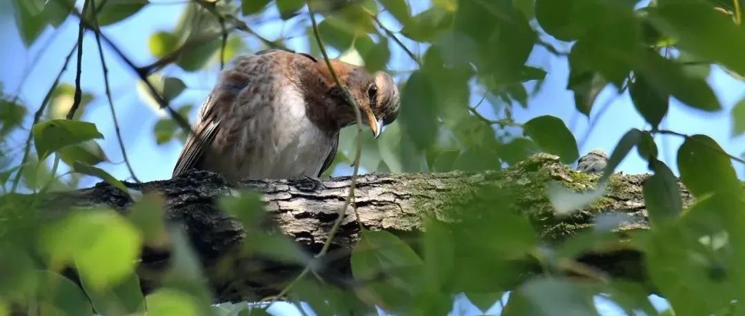 当前,公园中许多树上结满了果实,正是大量留鸟和部分越冬鸟类或旅鸟的当季食物。这只红尾鸫喜欢在公园低矮绿丛寻找食物,也喜欢飞上香樟树等采摘黑色的果实。它常常在树上一边进食,一边晾晒羽毛。