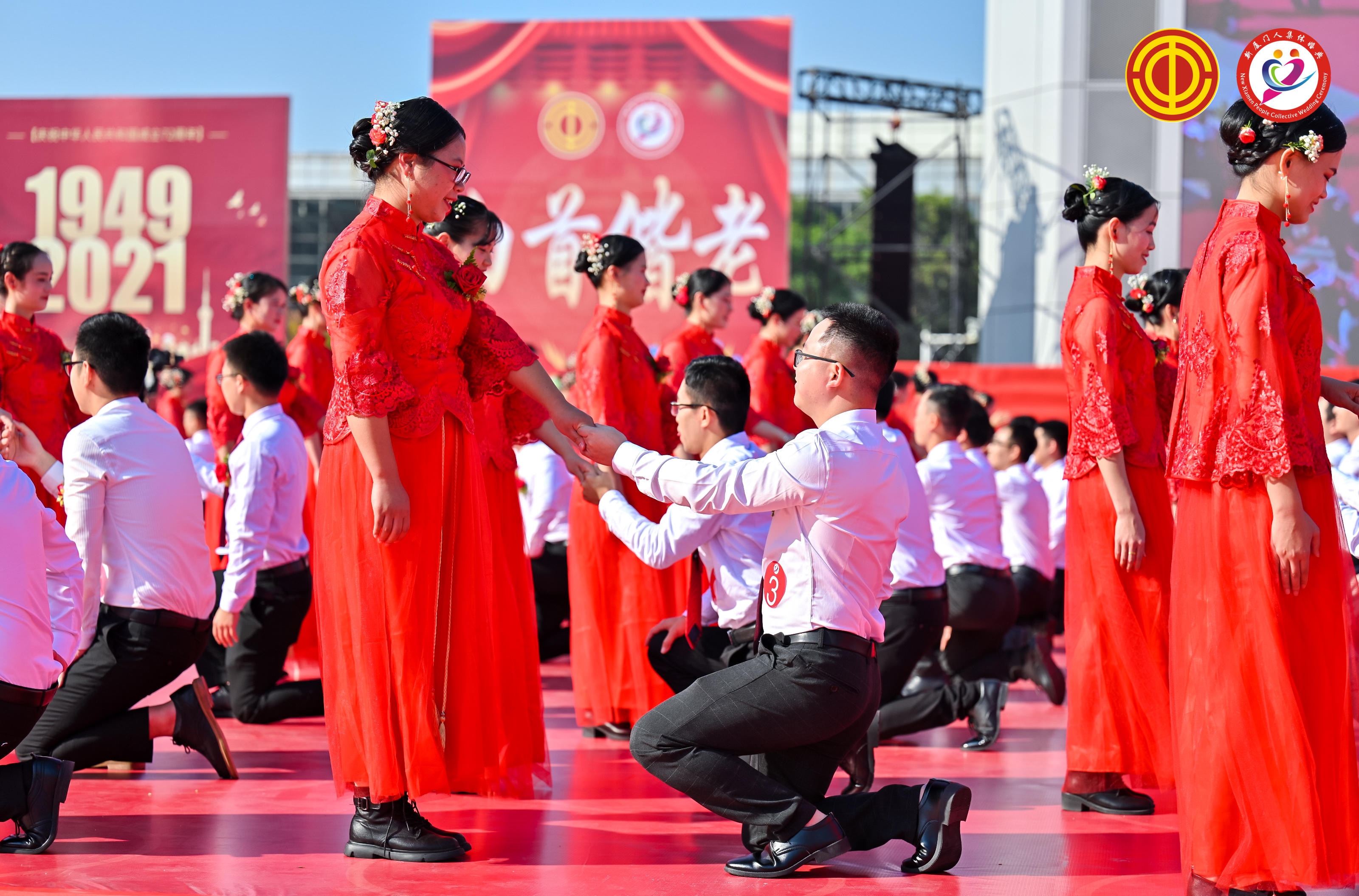 婚典现场,百对新人一起进行“幸福节拍”“爱的传递”等互动游戏,还献上了歌舞《不忘初心》,献礼建党百年,祝福祖国母亲。