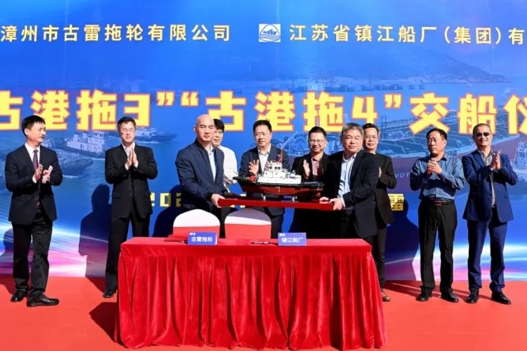 福建日报·新福建客户端12月17日讯 (通讯员 詹照宇)12月16日上午,由漳州市古雷拖轮有限公司(以下简称“古雷拖轮公司 ”)投资建造的“古港拖3”“古港拖4”交船仪式在北1码头古雷拖轮基地隆重举行。厦门港务控股集团党委委员、副总经理陈朝辉,区党工委委员、管委会副主任陈冠宏,厦门港引航站、厦门港古雷港航服务中心、漳州港务集团、古雷港口发展公司主要负责人等出席仪式。古雷拖轮公司和江苏省镇江船厂(集团)有限公司相关负责人分别代表双方签署了交船文件,并进行了船模交接。古雷拖轮公司主要负责人主持仪式。