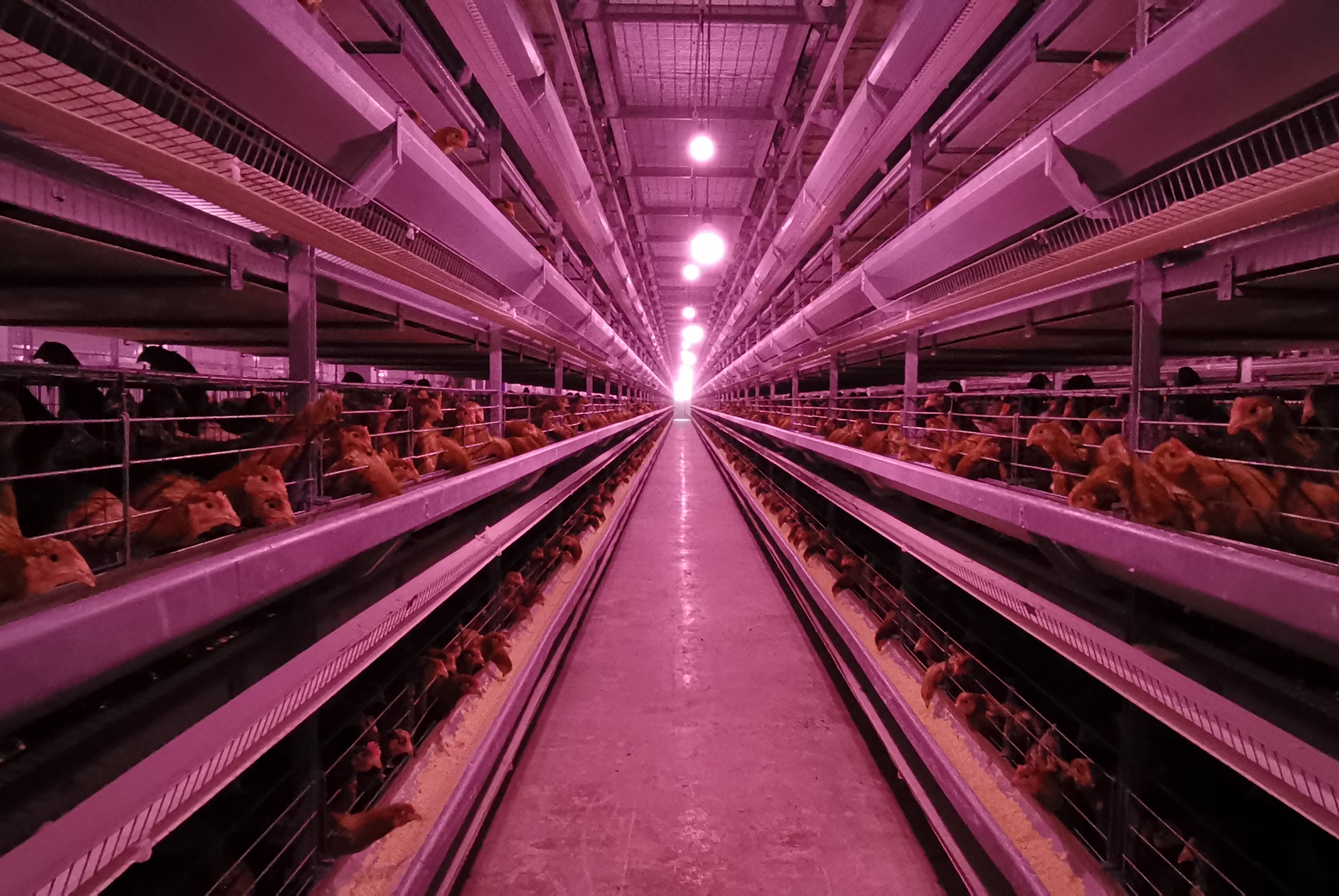 在经过专门的除菌区喷淋消毒,并换上鞋套后,记者进入已经投产的4号鸡舍。只见4列鸡笼呈H型整齐排列,每列又分为上下8层,每层的标准化养殖笼架前都各安装了一条食槽和一条蛋槽。同时,滴管式饮水系统、恒温供热系统、不间断换气系统等设备一应俱全。在粉红色的灯光下,鸡群在笼里悠然地啄食、饮水,过着“衣食无忧”的生活。