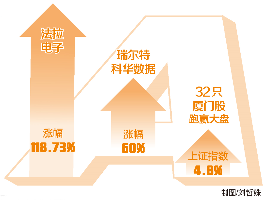 过去的一年,法拉电子一路默默上涨,最终年涨幅达到118.73%,不仅将市值提升到厦门板块的第二位,也给股民们带来了丰厚的回报。此外,瑞尔特、科华数据的涨幅也很可观,均超过了60%。去年,上证指数的年涨幅达到4.8%,跑赢上证指数的厦门股共有32只,占比超过一半。