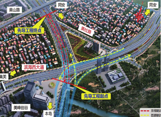 同安进出岛通道同安端先导段工程(同集路-滨海西大道段),南起美峰排洪渠北侧,经隧道下穿滨海西大道后,终于美山路附近。项目按照一级公路兼城市快速路标准建设,主线双向6车道,时速80km/h。