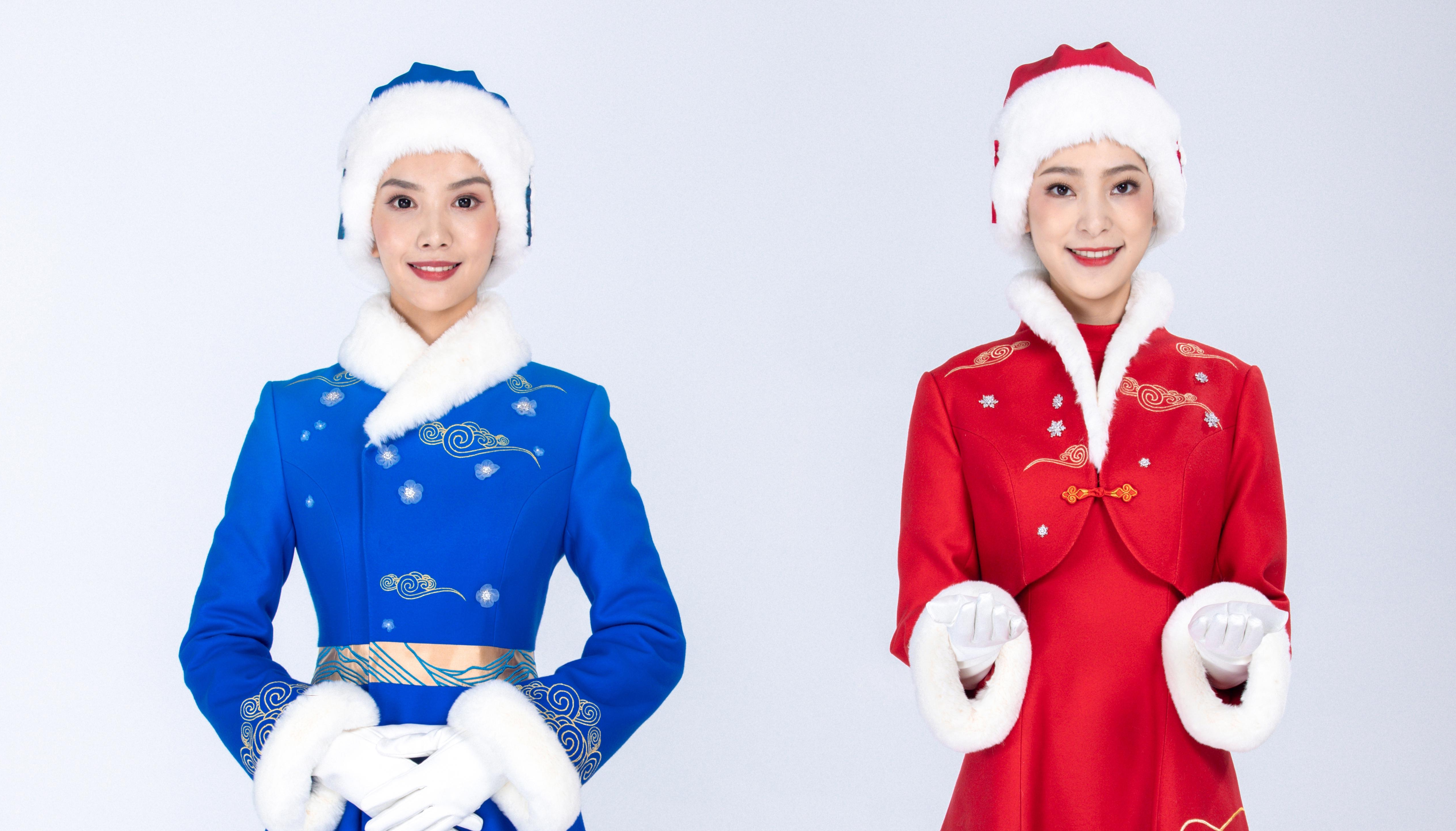 在服饰的色彩选择上,则运用了北京冬奥会色彩系统中的天霁蓝和霞光红两种颜色。“霞光红”是为凸显北京冬奥会正值春节期间举行,增添了欢乐喜庆的氛围,“天霁蓝”是雪后晴空的颜色,象征着冰雪的明亮纯洁,寓意梦想与未来。