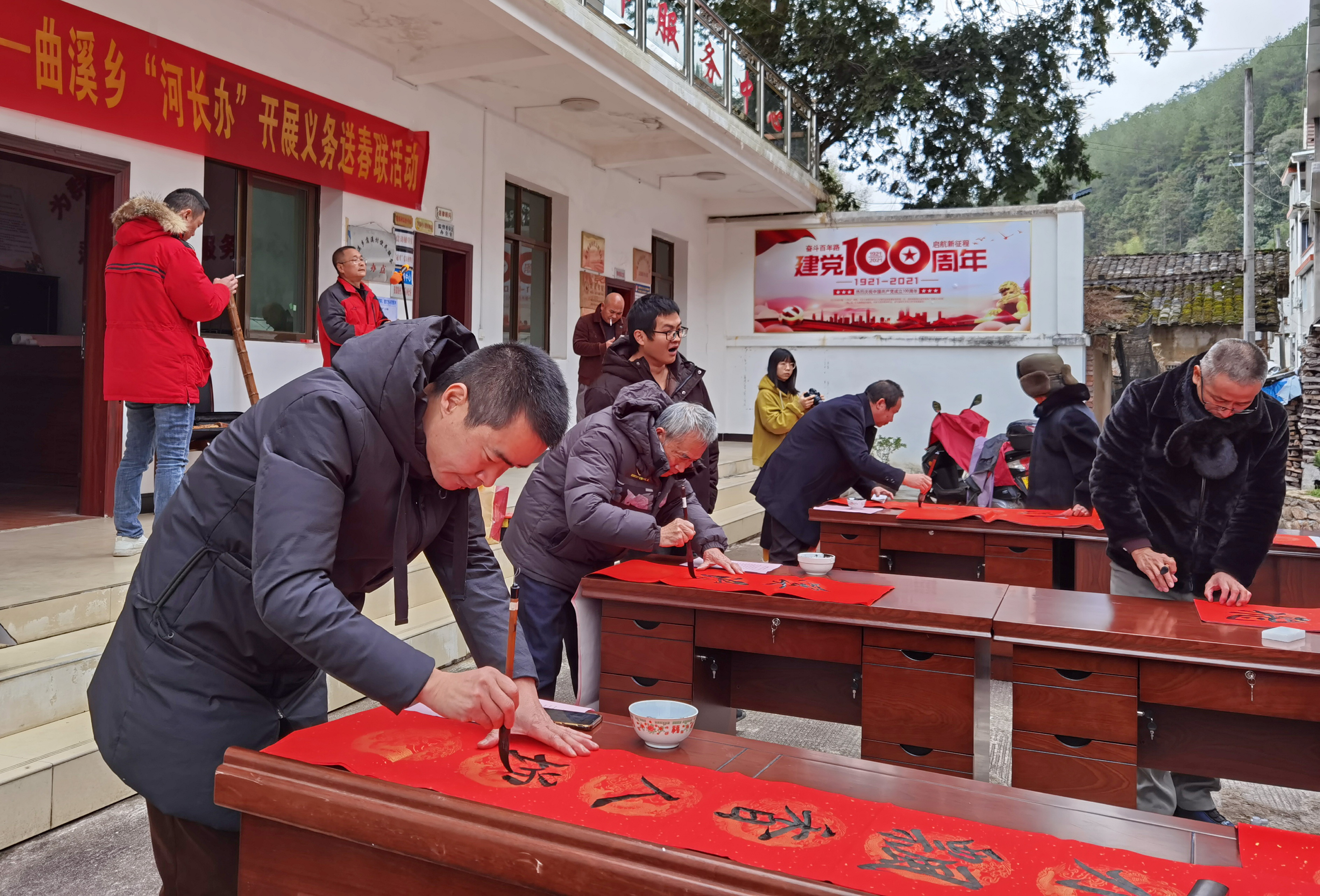 “曲水飘香人增寿,溪流润泽福满门。横批:河清海晏”“曲径竹翠迎百福,溪畔柳绿纳千祥。横批:鱼翔浅底”“林涛竹海掩曲径,古山瀑布濯清溪。横批:曲溪平安”……活动现场,书法爱好者们神情专注、挥毫泼墨,书写下一副副以保护绿水青山为主题的春联,这些春联由曲溪乡人大主席傅文达原创编写,每副春联皆蕴含了“曲溪”二字,描绘出曲溪的美丽山水,突显河长制工作成效。
