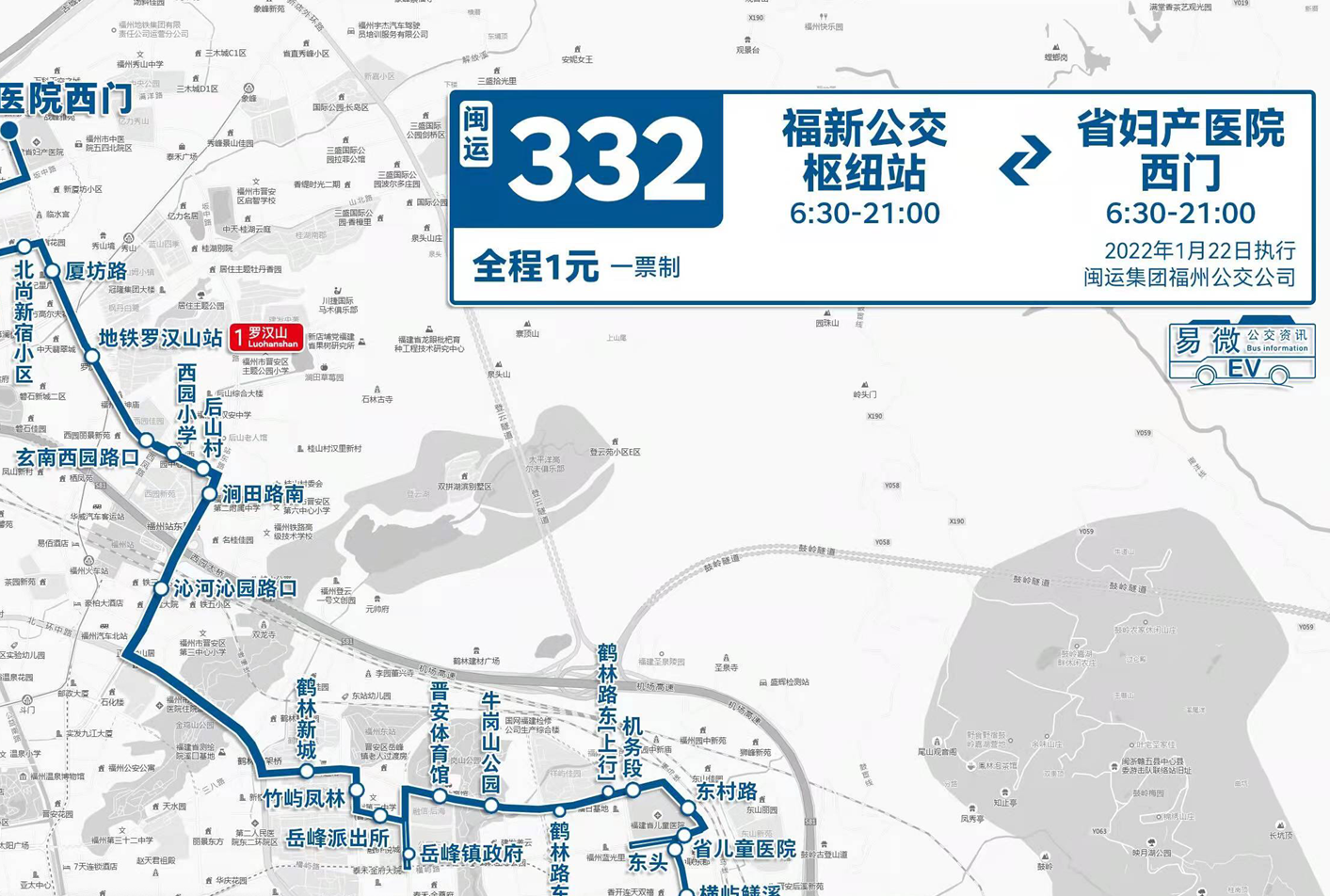 1月20日,记者从福州市道路运输事业发展中心获悉,为加强晋安区坂中路公交线网,方便群众出行,2022年1月22日起,变更332路公交线路的起讫站点和行驶走向。此次322路线路优化后,首次将省儿童医院和省妇产医院串联,大大方便了市民的出行。