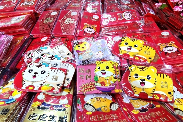 “虎年买个卡通老虎的红包袋给小孩包红包,感觉很喜庆,孩子也会很喜欢。”正在选购商品的消费者陈女士说,“新年就要喜气洋洋,今年准备把窗花换成这些‘小老虎’贴纸。”