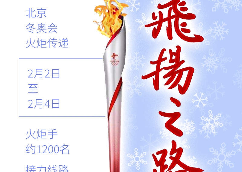 北京冬奥火炬接力2月2日至4日在北京、延庆、张家口三个赛区进行,约1200名火炬手高举“飞扬”传递圣火。这条“飞扬之路”,弘扬了奥林匹克精神,展现着中华民族风采。