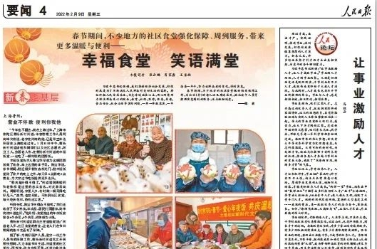 2月9日,人民日报要闻四版“新春走基层”专栏刊发通讯《幸福食堂 笑语满堂》,点赞各地社区食堂春节期间强化保障、周到服务,为群众更多带来温暖与便利。其中,福建省福州市鼓楼区安泰街道居家社区养老服务照料中心食堂做好相关保障工作,为社区老人提供实惠周到的用餐与生活服务,让老人们既吃好饭,又过个暖心年。