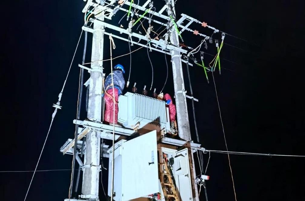 工作人员抵达现场仔细排查分析后发现——变压器内部出现故障,需要更换新的变压器。经过多方协调,新的变压器被紧急调运到现场。在深夜4摄氏度的寒潮环境中,抢修人员不顾寒冷,有条不紊地开展抢修工作。历经近4个小时的紧急抢修,古雷镇供电所抢修人员顺利完成了北江大庙二变的安装、调试、供电工作。