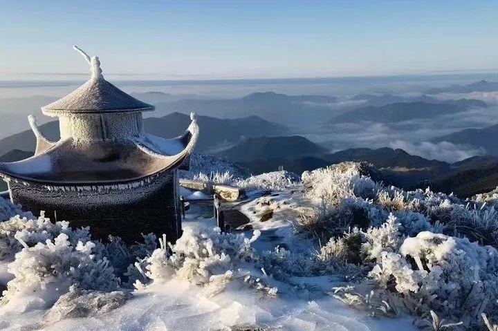 连日来,世界地质公园白云山出现持续降温大雪,景区成了银装素裹的冰雪世界。2月24日,雪后初霁,阳光朗煦,残雪犹容,树丛上挂满洁白亮丽的雾凇、冰挂,宛如冻画世界。景区里层层山峦,座座石峰身着银装在冬阳的照耀下显得更加俊秀多姿,吸引无数中外游客和摄影爱好者取景留影。