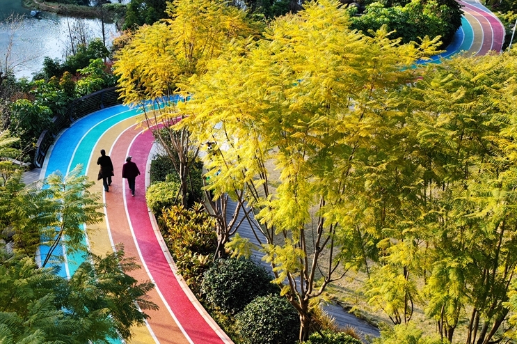 “以前只能在小区里转一转,现在好啦,可以带着孙子到公园里锻炼身体,呼吸新鲜空气!”跟老郭带着老伴散步健身不同,雷依姆带的是4岁的孙子凯凯,他们一路在郊野福道的彩虹步道游玩,这样的遛娃方式让她很是惬意。