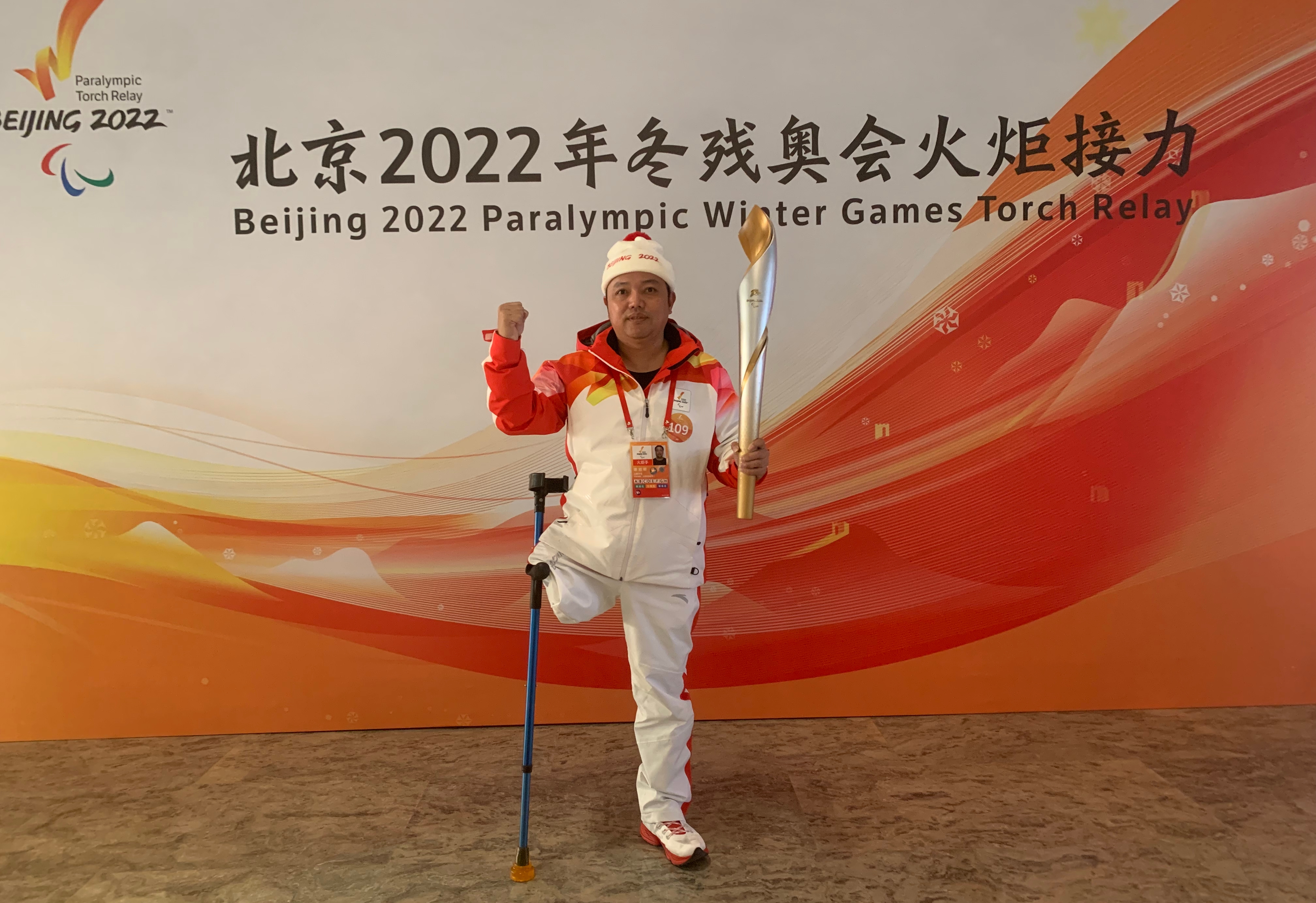 只有一条腿的谢启明,走路会有些费劲,但在火炬传递当天,他婉拒了使用轮椅护跑服务。他左手高举火炬,右手拄拐、单腿前行,以坚定而有力的步伐将圣火传递给了下一位火炬手。全程约五六十米,谢启明走了大约1分钟。“今天我不光为了自己,更是代表家乡的残疾人兄弟姐妹完成这个神圣且光荣的任务。所以,我一定要站着、独立完成它。我希望用这种方式传递残奥精神。”谢启明说。