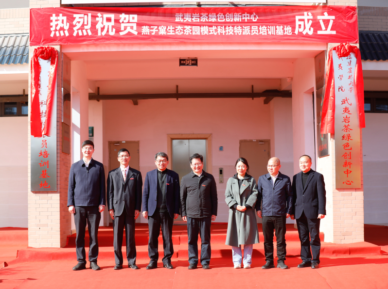 3月9日上午,武夷岩茶绿色创新中心和燕子窠生态茶园模式科技特派员培训基地揭牌仪式在武夷学院举行。福建农林大学党委书记、博士生导师王建南,国家级领军人才、福建农林大学根系生物学研究中心主任廖红,南平市科技局党组书记、局长余洲,武夷山市委副书记、市长谢启龙,首批国家级非物质文化遗产武夷岩茶(大红袍)制作技艺传承人刘宝顺;武夷学院党委书记庄祥生,党委副书记、校长吴承祯出席揭牌仪式。武夷学院党委委员、副校长郑细鸣主持揭牌仪式。