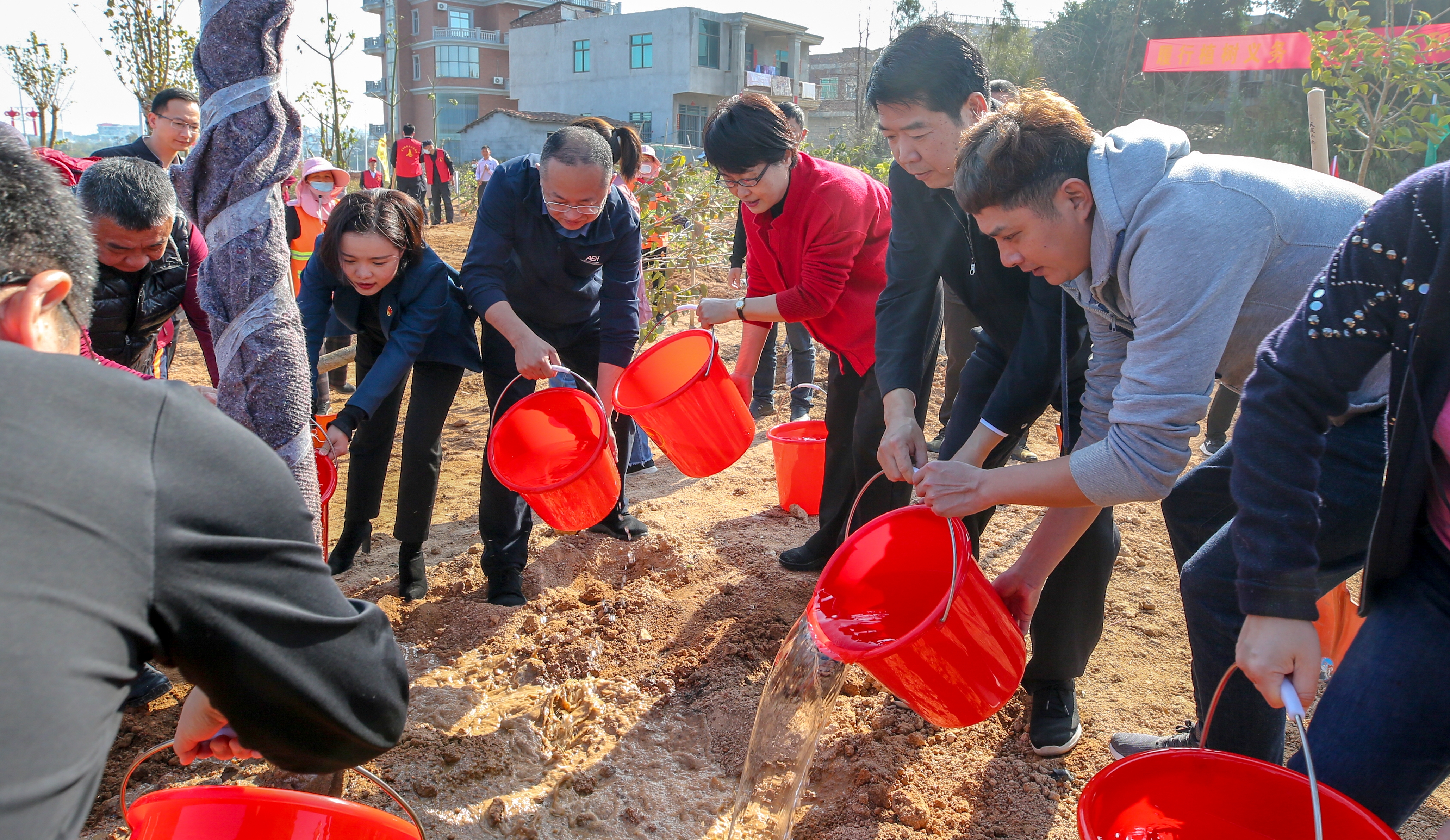 上午8点半,志愿者们身穿红色马甲,拿着铁锹,提着水桶,来到位于湄洲岛新西环路旁的植树现场,干劲满满地投入植树中去。大家三五人一组,挥锹挖坑、扶正苗木、填泥夯土、拎桶浇水,在总面积约20亩的植树活动现场到处都是忙碌的身影。经过一个上午的辛勤努力,684株高山榕、美人树、台湾栾树等树苗全部栽种完毕,为初春的湄洲大地增添了一片生机勃勃的绿色。