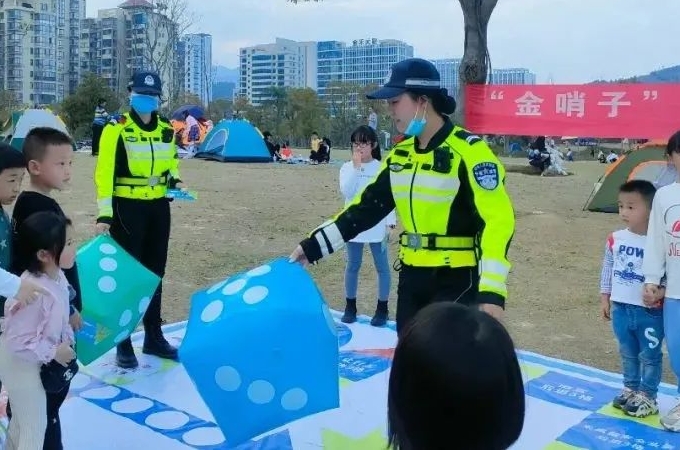 “啊,我踩到“酒驾”格子了,得后退五步”“我和女骑小姐姐一起学做直行信号,可以前进三步呢”在特制地图上,小朋友们通过抛掷骰子遇到不同标示进行通过、停止、后退等,最终达到终点的人,获得胜利。女骑队员与家长共同引导孩子参与游戏,让“游戏的快乐”变为交通安全“知识的学习”。