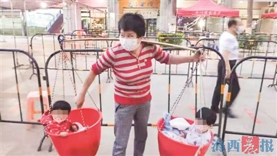 3月20日下午,天色渐渐暗了下来,翔安马巷舫星社区核酸采样点排队的人也越来越少。一位身穿红白条纹衣的老人挑着扁担,两个大红筐里坐着自己的两个孙女,十分吸引眼球。