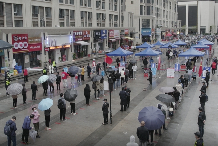 “10人一组,大家排好队!”28日上午9点,记者在中海寰宇天下小区看到,小区分两处设置了核酸采样点。在社区工作人员和志愿者的指引下,市民们10人为一组登记后,进入“缓冲区”待检,等一批10人全部完成采样后,下一批再依次进入。