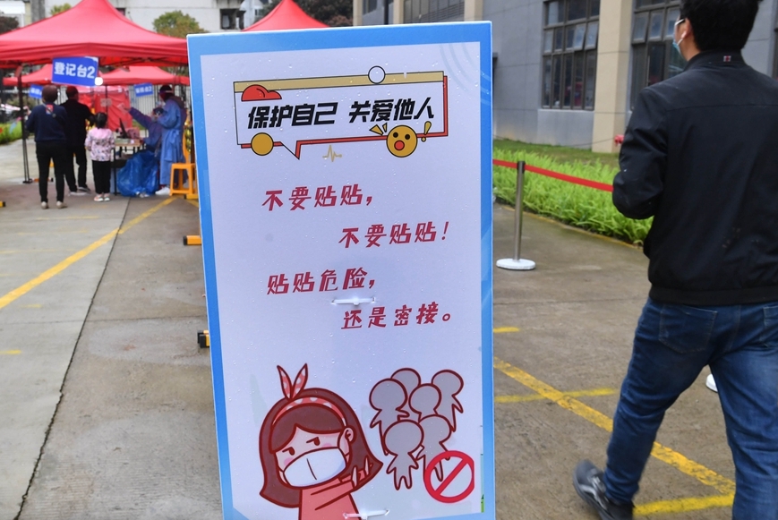 “红管管,白签签,排队一起做酸酸;做酸酸,不要钱,做完酸酸心里安。”27日上午,福州市鼓楼区洪山镇大凰山社区的全员核酸检测点,挂起了一张张特别的宣传牌,除了朗朗上口的话语,还配上了卡通形象。排队的居民陈先生告诉记者,“这些宣传牌十分生动有爱且有趣,让枯燥的排队增添了许多快活的氛围”。