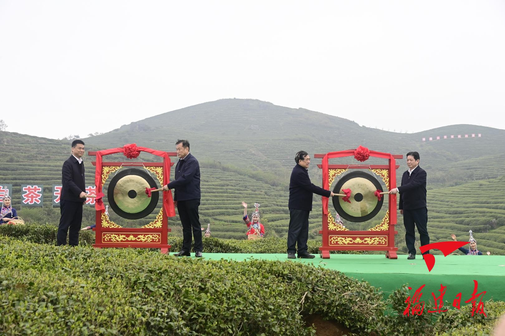 “开茶喽……”只听一声声嘹亮的喊山开茶回荡在福鼎佳阳天湖山,福建省政协原副主席、海峡两岸茶业交流协会会长陈绍军、宁德市委书记梁伟新、副市长叶其发与福鼎市委书记林青共同为本届开茶节鸣锣开茶。